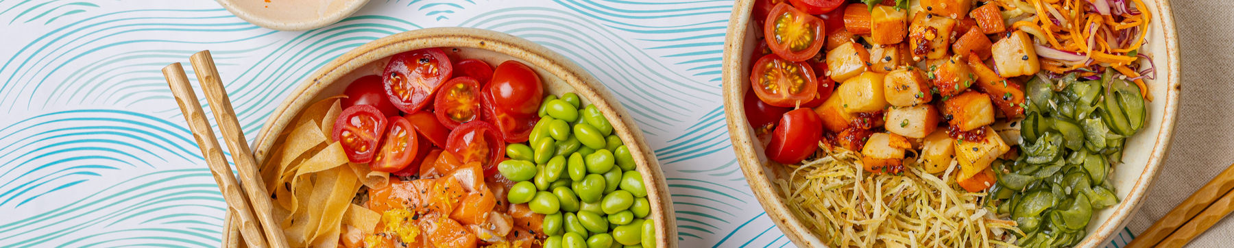 Monte o poke do seu jeito: escolha 1 base, proteínas, acompanhamentos e crocante.